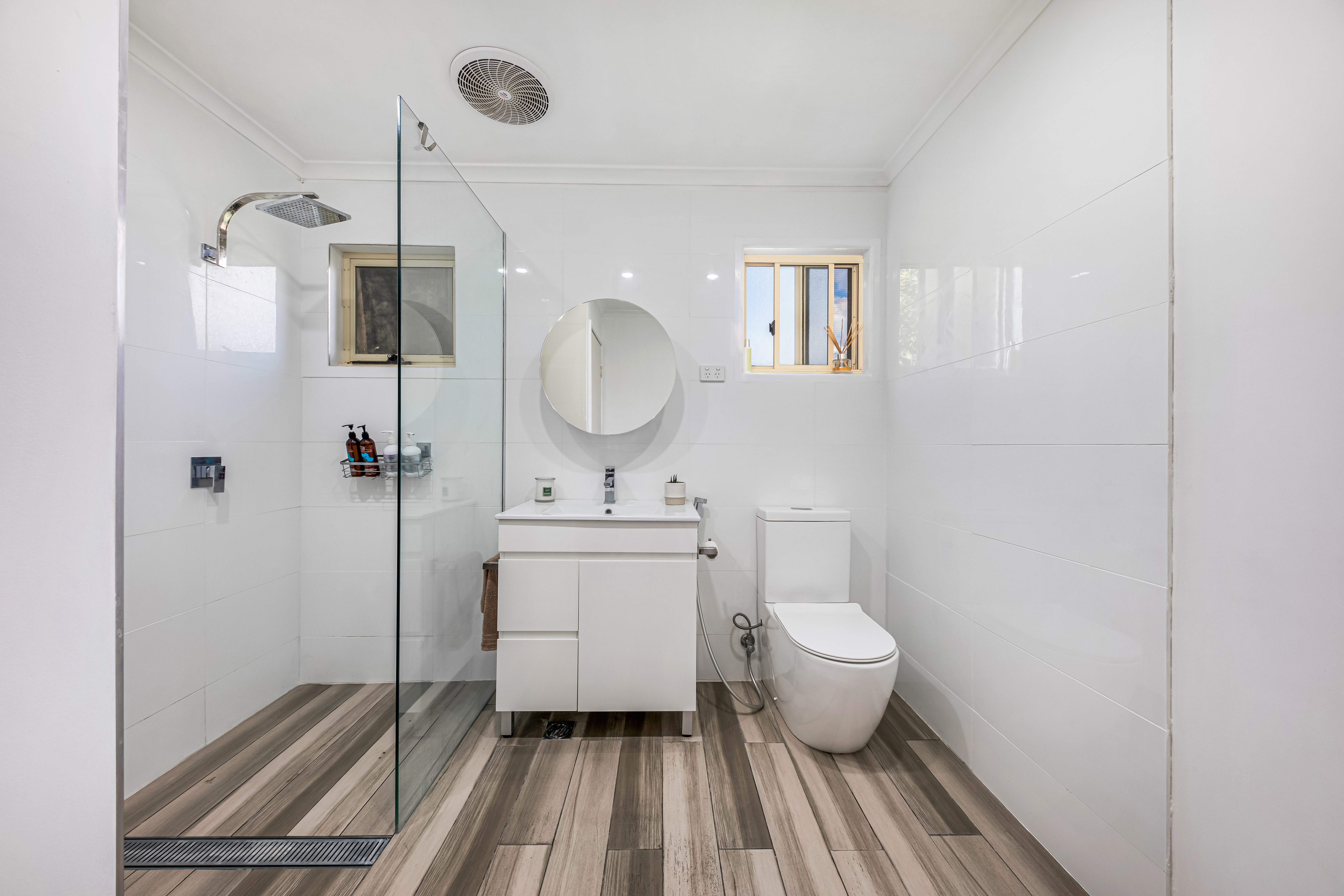 Newly renovated spacious bathroom with floor to ceilings tiles