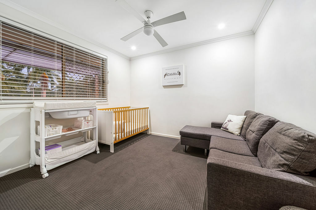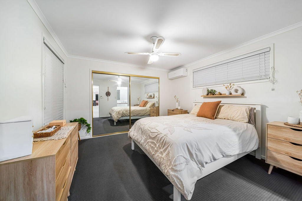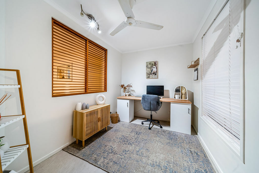 As you step inside, you'll be greeted by four spacious bedrooms, along with a versatile study room. The master bedroom, living areas, and bedroom four/retreat are thoughtfully equipped with air conditioning to ensure year-round comfort. Ceiling fans and elegant timber Venetian blinds enhance the ambience throughout.