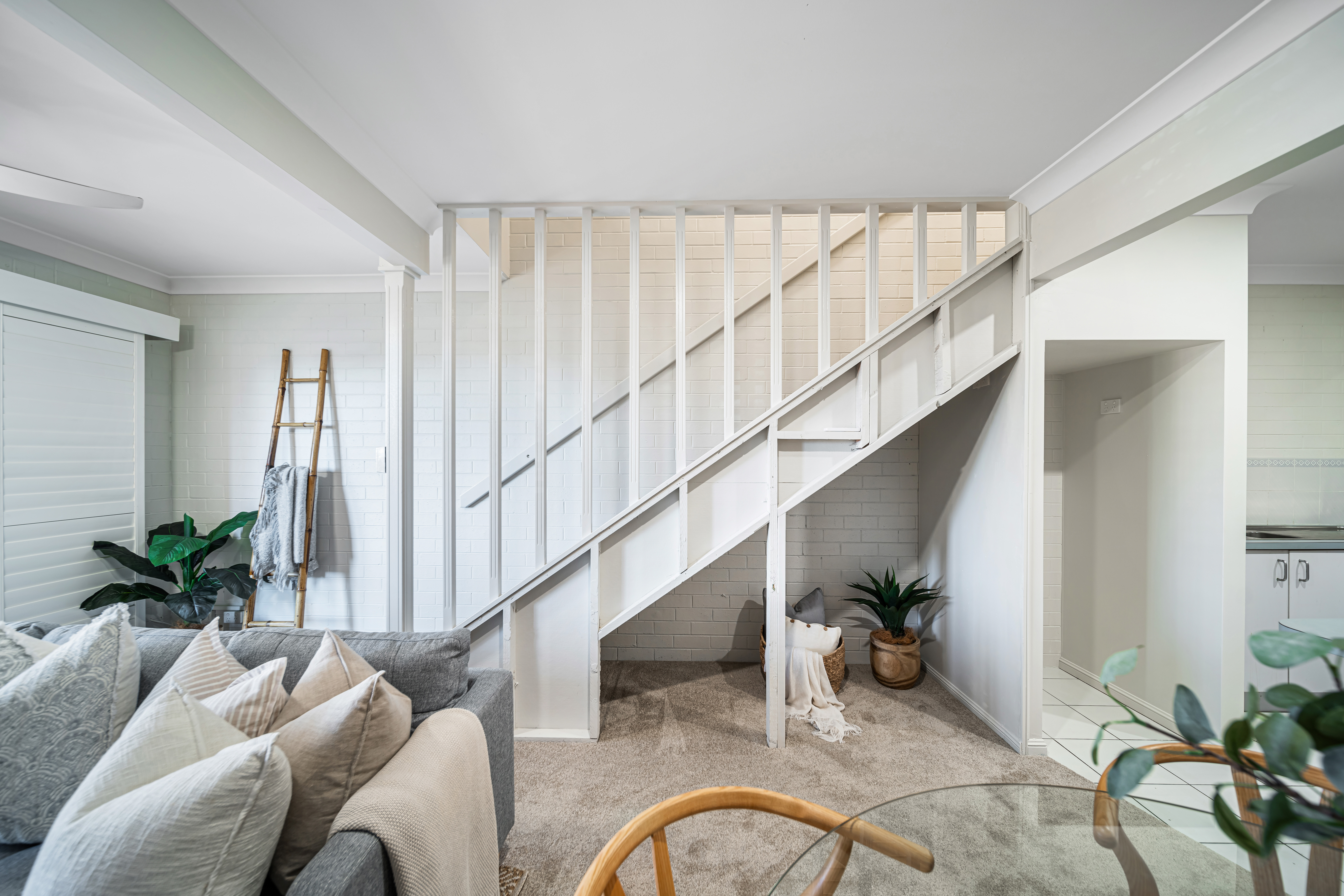 On the lower level, you’re welcomed into the heart of this home, with welcoming living and dining spaces that flow out to the balcony, complete with privacy screening adjustable shutters for light and visibility.
