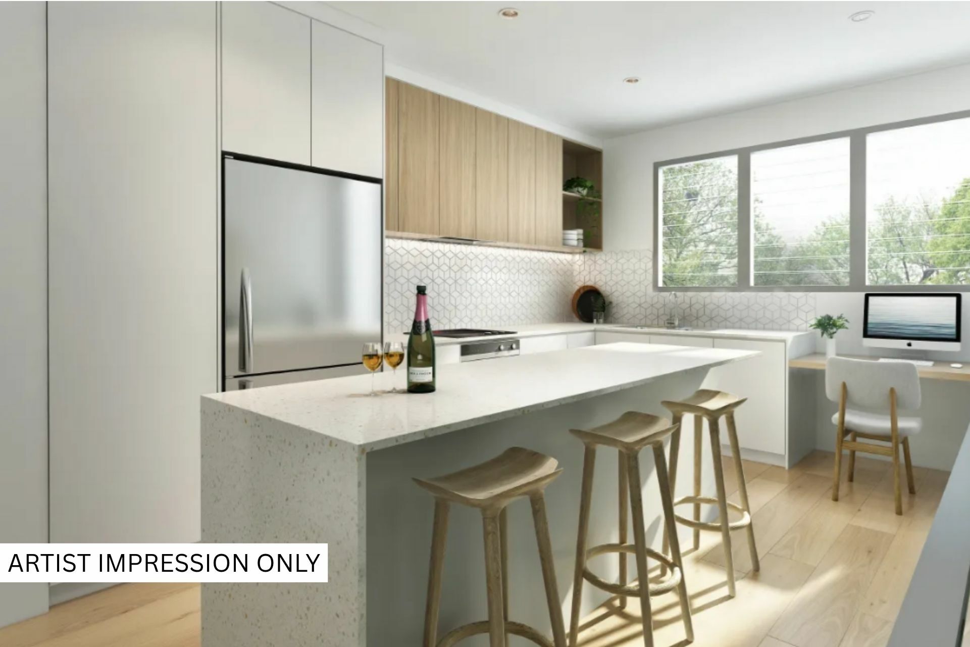 Inside, the open-plan main living level showcases a stylish stone-topped kitchen, quality appliances, and plenty of integrated storage, along with a cleverly positioned study desk perfect for those working from home. Split-system air conditioning in the living area and both master suites ensures comfort across all seasons.